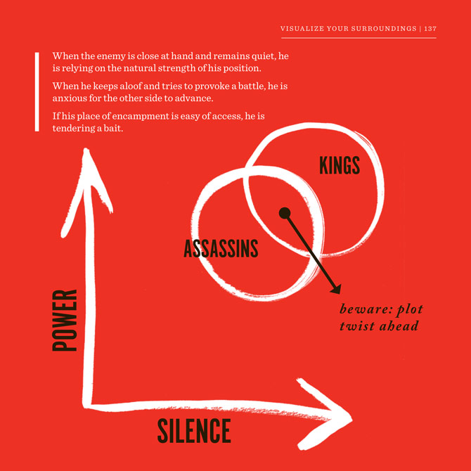 Today, we're running pages from Jessica Hagy's excellent new book "The Art Of War Visualized"! I know so many people hold Sun Tzu's The Art Of War in such high esteem for a ton of fields, but this is the first time I found it accessible - it's a great take and great read. Highly recommended!