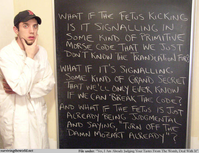 No one ever takes the time to read the heiroglyphics on the inside of the uterus, so Fetus Morse Code it is.