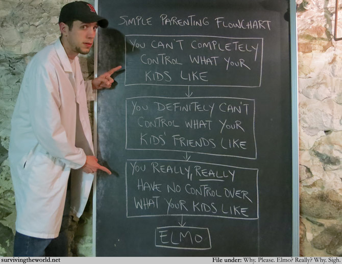 When the overlords at Cannonball's daycare offer to read an Elmo book to the toddlers in return for them cleaning up, and the kids all shout "ELMO!" and immediately start cleaning up, I immediately shudder, just as I'm sure that my parents shuddered based on what I wanted to watch or enjoy when I was a kid. Sigh.