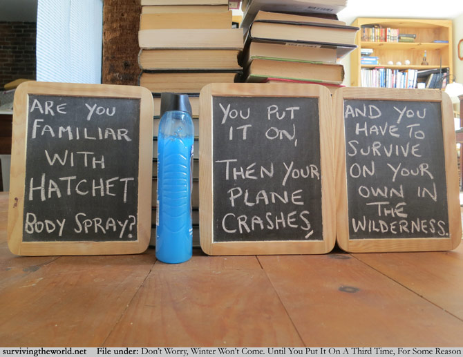 This is such a specific pull to the young adult book "Hatchet" that I can't imagine many of you will possibly enjoy it. You know there were four more books in that series? No, I imagine many of you probably don't. Because you hadn't heard of the first one, right? Sigh. I have way too many random things roaming about my head when I take a shower in someone else's house and see what random shower gels I have to choose from.