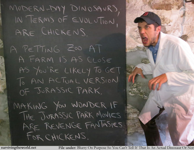 Before you ask how chickens rose so high in Hollywood that they were able to green light so many dinosaur movies in which people are eaten, please focus on the math in the bigger picture here - Jurassic World has made a poopton of money. How could it have possibly made that much money? There are three chickens per human in the world. If chickens are going to see the movie to root on the dinosaurs - even when paying the discounted rate for a chicken ticket - then the money would clearly keep rolling in. C'mon, people! How am I the only one to see this! Chickens watching their ancestors up on the big screens, feeling pangs of jealousy, plotting out their own modern Jurassic Park uprisings . . . I think what I'm saying is, if you take your child to a petting zoo, keep a close eye on the poultry.
