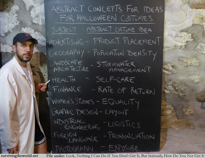 Halloween is here! The best holiday of the year, no doubt about it. The abstract Halloween costumes series probably remains my favorite STW series, in both that it is Halloween related, abstract, and completely ridiculous. This is the 9th and final installment of this series, so I've collected all the suggestions onto a single page (and included some photos of readers who have attempted one or the other of all these suggestions!). If you attempt any of the above, or any other items on the overall list, please send a picture along! I love seeing costumes and to think that you're insane enough to try simply even one of these idiotic ideas is doubly delightful.